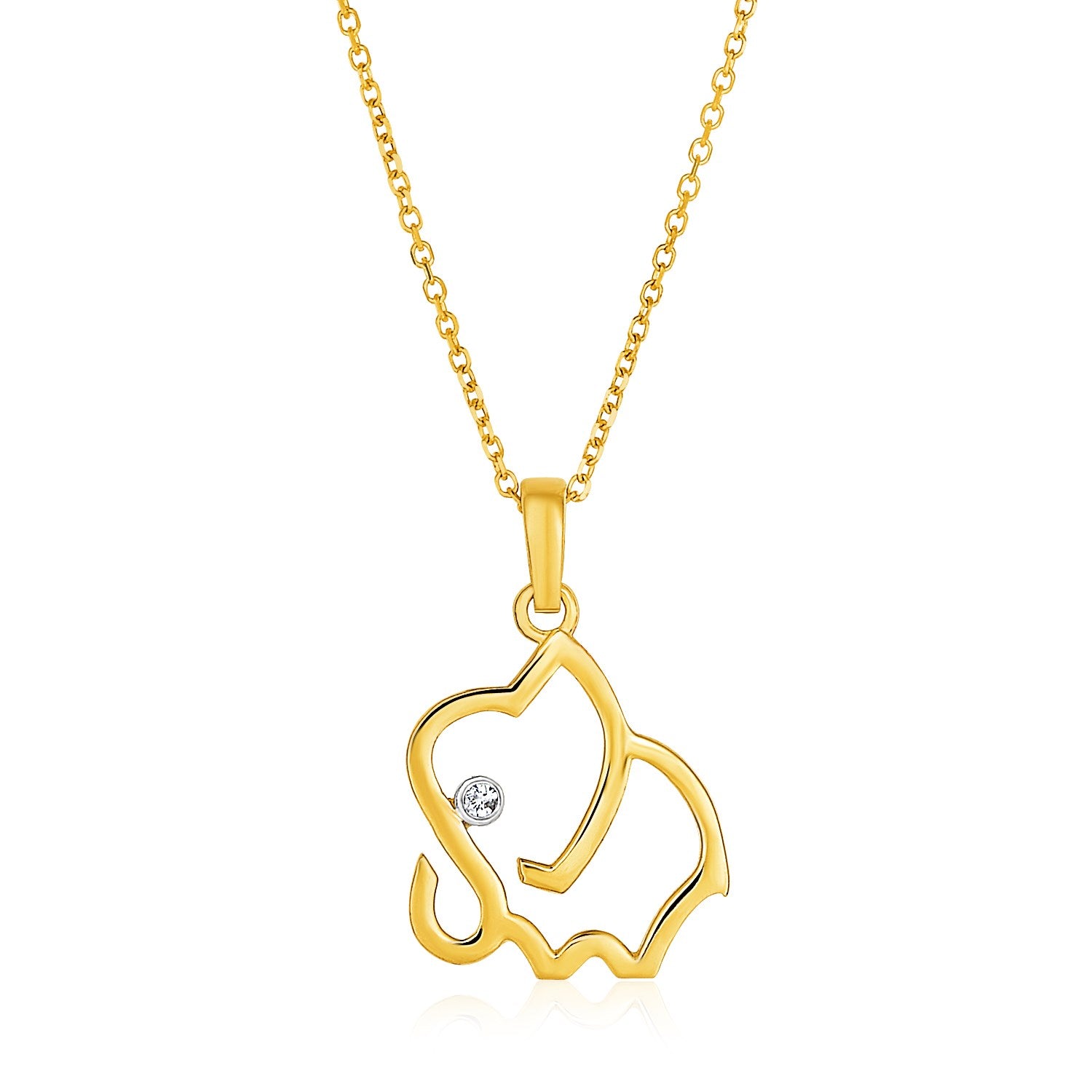 Wear this stylized elephant in gold with a diamond. 0.8 millimeters diamond cut cable chain necklace is 18 inches long and closes with a lobster clasp.