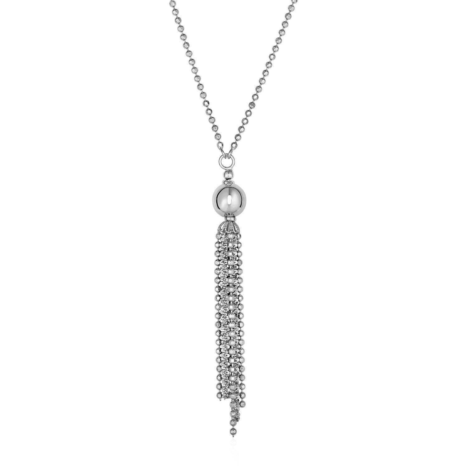 A modern update to a classic, this silver ball chain necklace is highlighted by a striking tassel of polished and textured chains. Necklace is 18 inches long and closes with a lobster clasp.