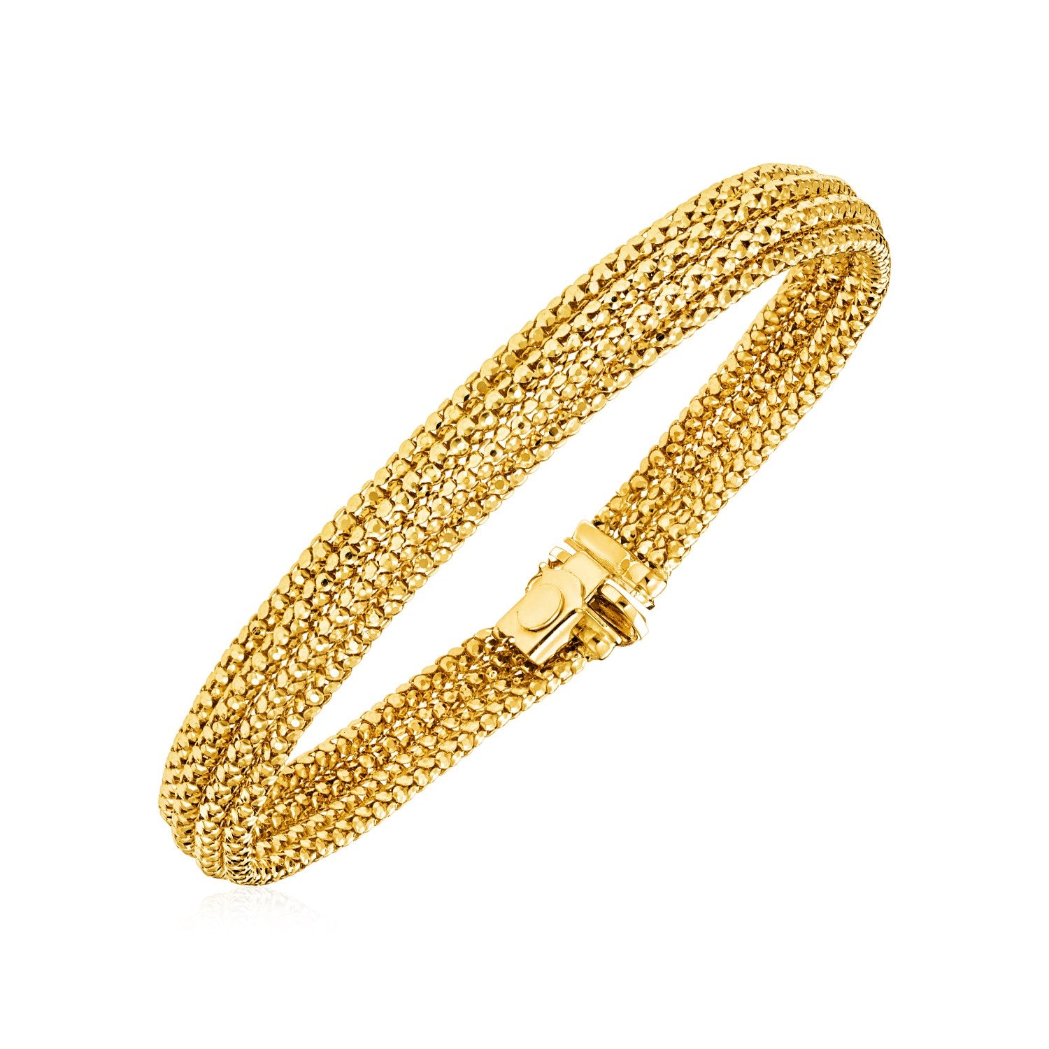 Stacked strands of dazzlingly textured 14k two tone gold combine beautifully to create this timeless, sophisticated bracelet. Bracelet is 7 1/4 inches long, 8mm wide, and closes with a box clasp.