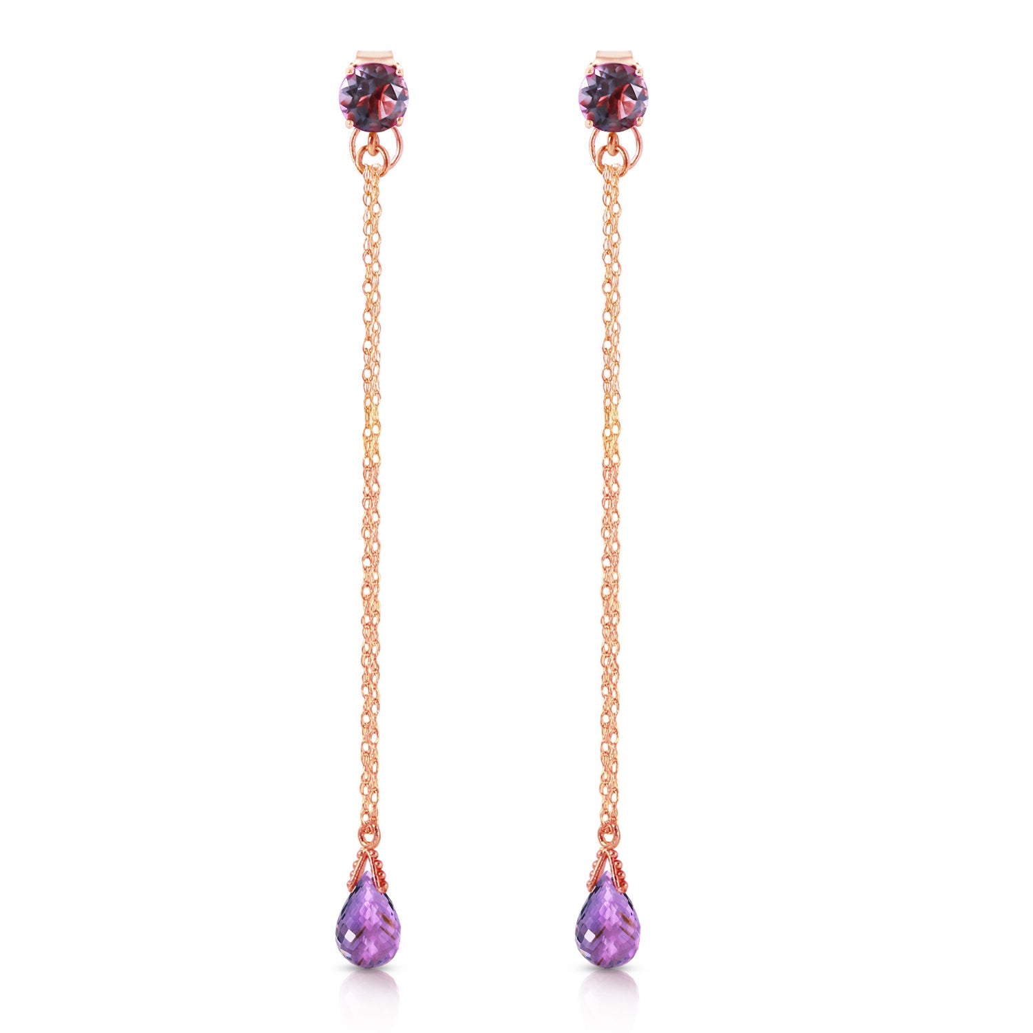 These 14k gold chandelier earrings with natural amethyst offers a simple but fun jewelry style. Dainty and beautiful solid gold chains are used to suspend two carats of briolette shaped amethyst stones. Two additional round shaped amethyst stones weighing over one full carat add more sparkle and depth to this beautiful pair. Friction push backs are used to hold these stunners securely and comfortably in place as they dangle delicately from the earlobes. These earrings are perfect for those who love the stunning color of amethyst, as well as for those who were born in February.