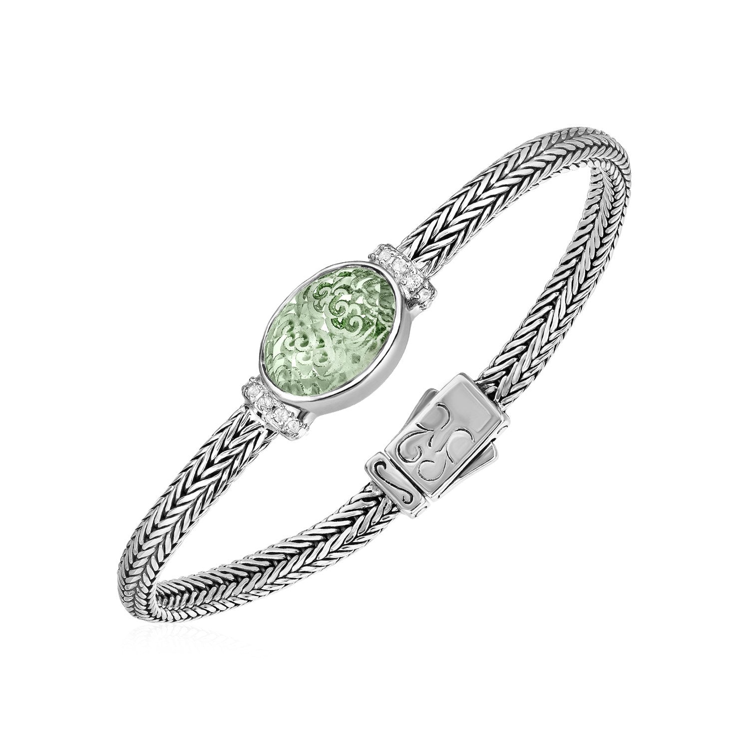 Woven Rope Bracelet with Green Amethyst and White Sapphires in Sterling Silver
