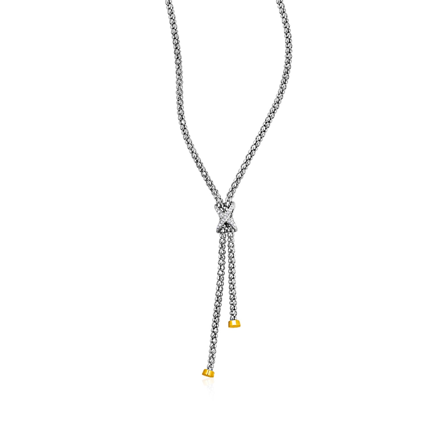A modern popcorn texture and the sparkle of diamonds and 18k yellow gold details updates a classic sterling silver lariat necklace. The necklace is 18 inches long and closes with a lobster clasp.
