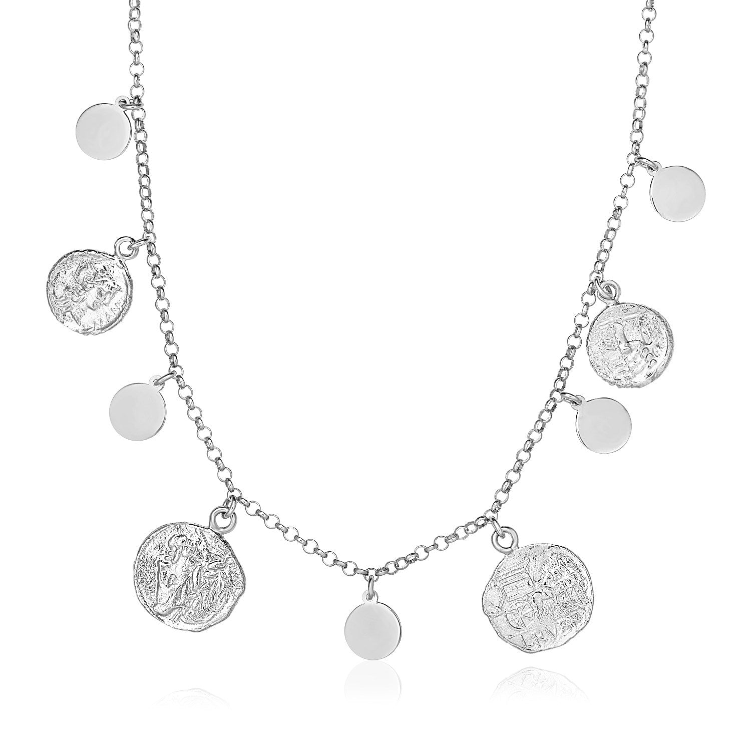 Sterling Silver 18 inch Necklace with Roman Coins and Polished Circle Charms
