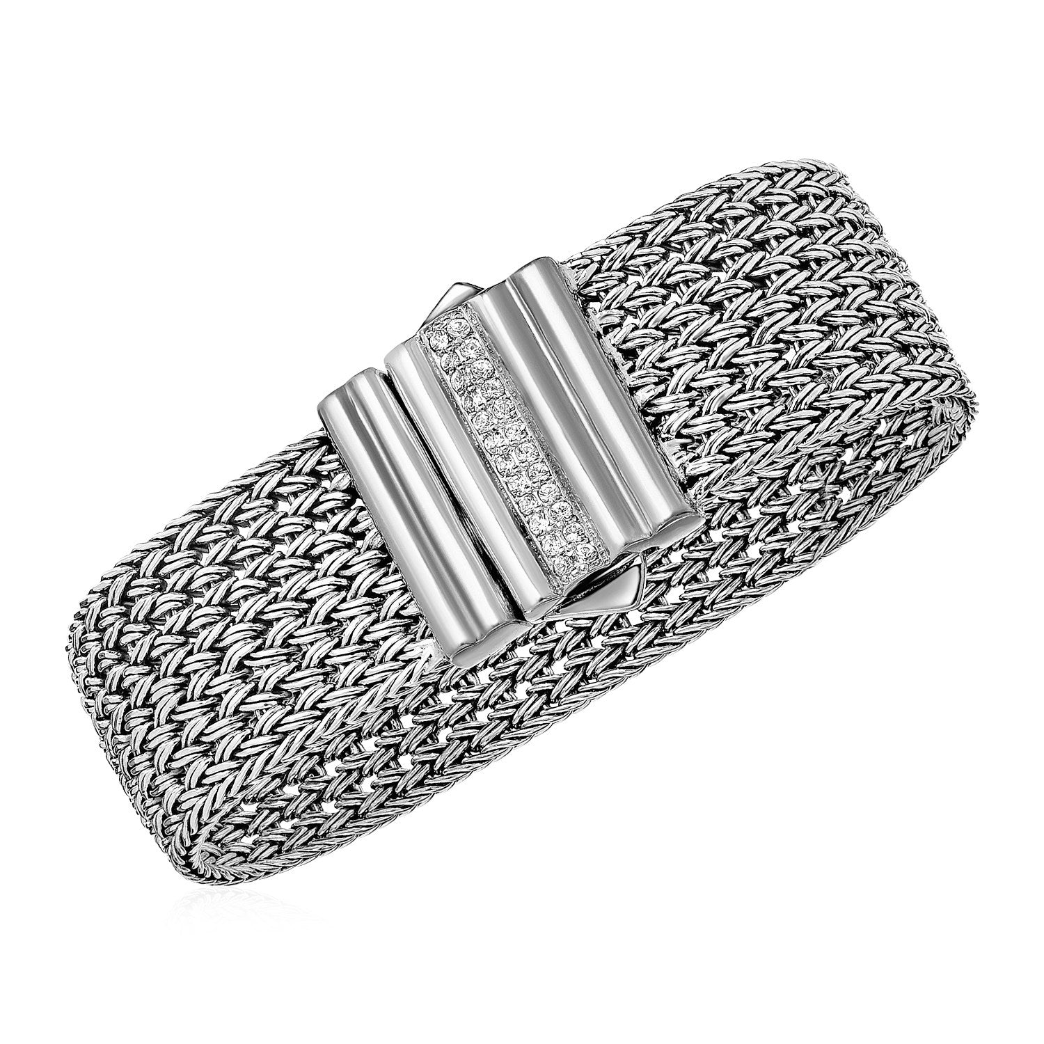 Wide Woven Rope Bracelet with White Sapphire Accented Clasp in Sterling Silver
