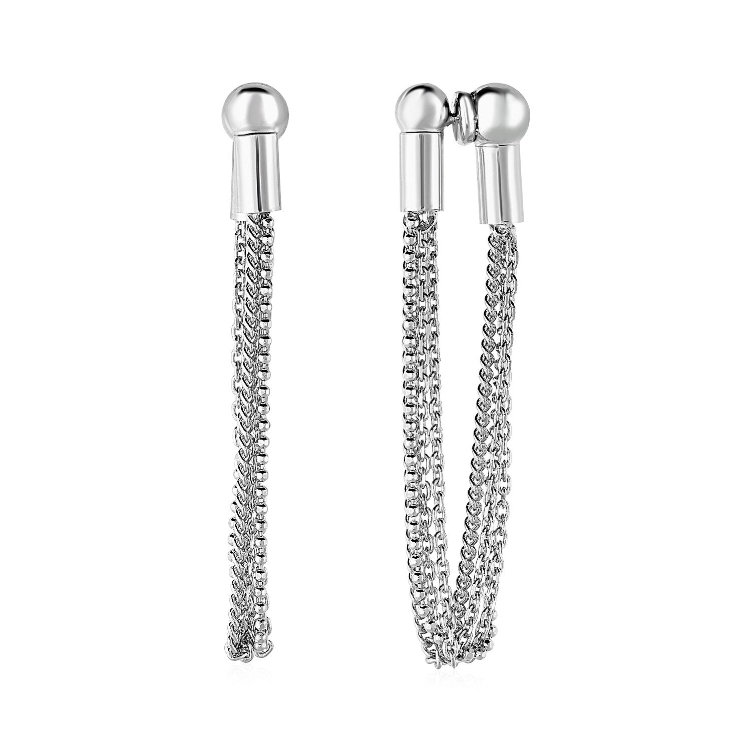 Multiple silver chains connecting the fronts and back clasps of these elegant silver earrings will add modern sophistication to any occasion. Post earrings are 52 millimeters long, 5 millimeters wide, and are held in place by pushback clasps.