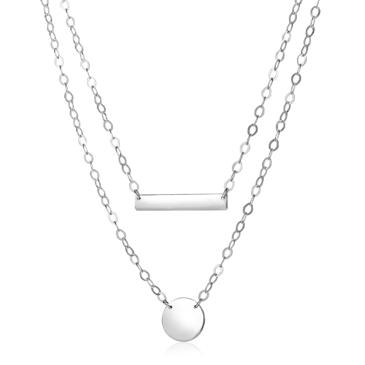 Simply geometric and elegant, this lovely two-strand sterling silver necklace is highlighted by a horizontal bar pendant and a polished disc pendant. Necklace is 18 inches long and closes with a lobster clasp.